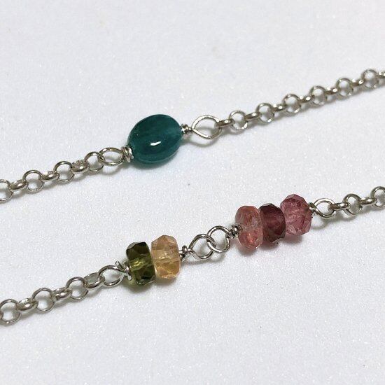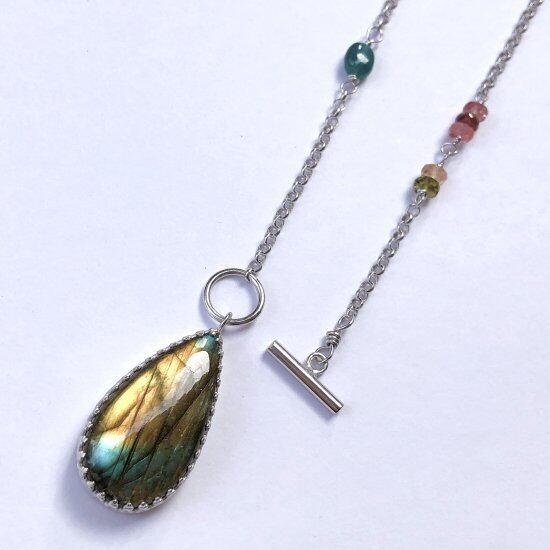 ラブラドライトの多色性となじむような色合いのトルマリンのカットビーズと、明るい森のようなグランディディエライトのビーズをチェーンの左右にあしらい、留め金を前に配置しています。チェーンの端にあるバーを、ラブラドライトの上にある輪に通して開閉します。