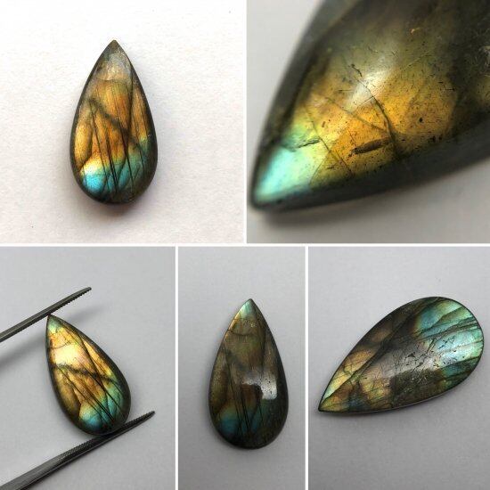 こちらのラブラドライトはイエロー系が強く、グリーンやブルーもグラデーションを描きながら現れます。