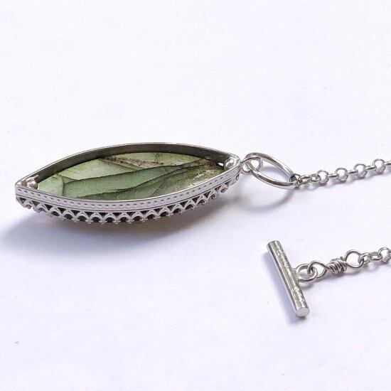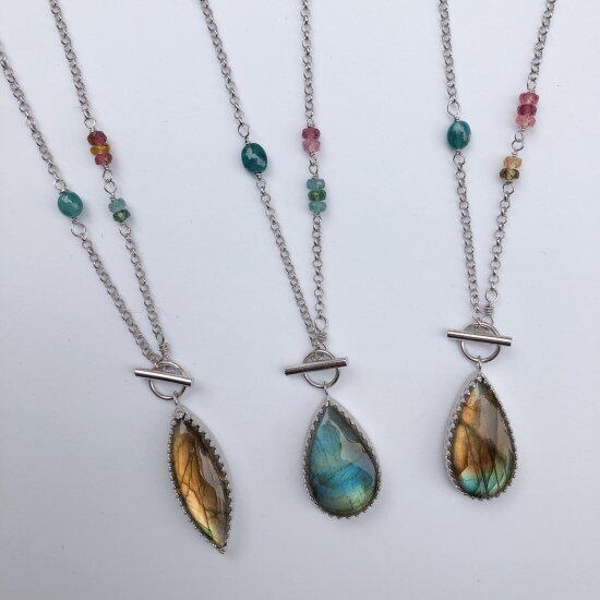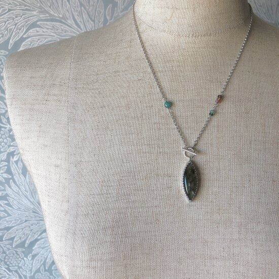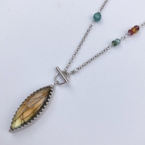 ラブラドライトの多色性となじむような色合いのトルマリンのカットビーズと、明るい森のようなグランディディエライトのビーズをチェーンの左右にあしらい、留め金を前に配置しています。チェーンの端にあるバーを、ラブラドライトの上にある輪に通して開閉します。
