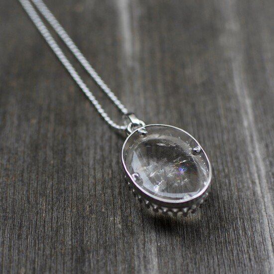 虹を含んだ朝露のようなクリスタルクォーツをクラシカルなシルバーの枠で包み、ネックレスに仕立てました。