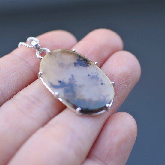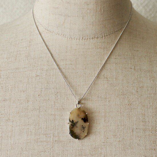 まるで植物を閉じ込めたような、ボタニカルなたたずまいのデンドライトでネックレスを仕立てました。ひとつひとつが個性的なデンドライトは、まるで絵画か水墨画のようでもあり、かたち、模様全てにおいて同じものは存在しません。